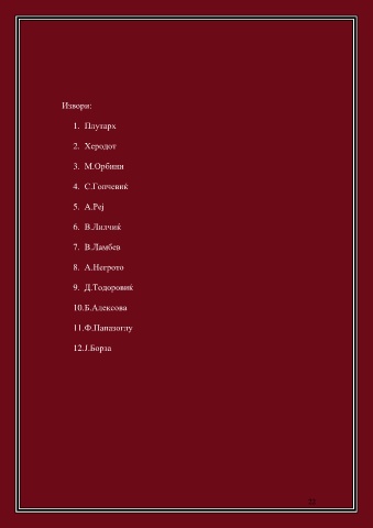 Извори: 1. Плутарх 2. Херодот 3. М.Орбини 4. С.Гопчевиќ 5. А.Реј 6. В.Лилчиќ 7. В.Ламбев 8. А.Негрото 9. Д.Тодоровиќ 10. Б.Алексова 11. Ф.Папазоглу 12. Ј.Борза 22 2 2
